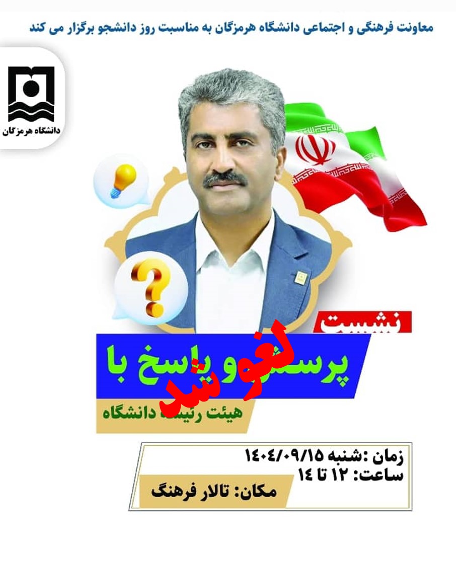 به اطلاع دانشجویان محترم دانشگاه‌ هرمزگان می‌رساند بنا بر تصمیم هیئت رئیسه محترم دانشگاه هرمزگان مبنی بر غیرحضوری شدن دانشگاه در روز شنبه 15 آذر 1404، در راستای رعایت دستورالعمل‌های بهداشتی و حفظ سلامتی دانشجویان عزیز، نشست صمیمانه دانشجویان با هیئت‌رئیسه دانشگاه هرمزگان به مناسبت روز دانشجو لغو گردید.
