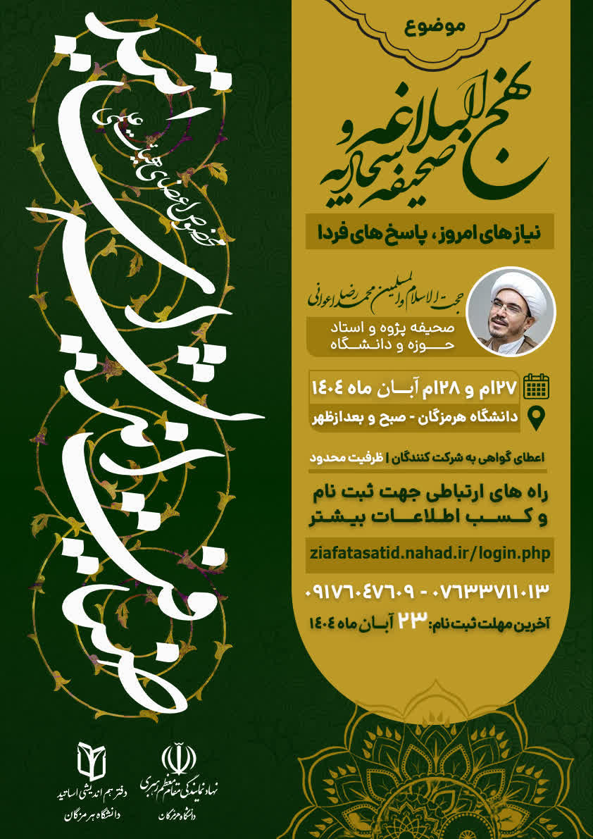 ضیافت‌ اندیشه‌ اساتید دانشگاه‌ هرمزگان‌ با‌ عنوان‌ «نهج‌ البلاغه‌ و‌ صحیفه‌ سجادیه، نیازهای‌ امروز‌، پاسخ‌های‌ فردا»‌ برگزار‌ می‌شود.